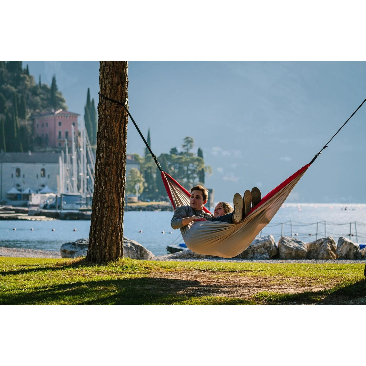 Om te ontspannen ga je in de hangmat liggen volgens de Braziliaanse ligtechniek: de hangmat wordt niet strak opgehangen. Het is cruciaal dat de ophanglussen van de mat op hoofdhoogte worden geplaatst, en slechts ongeveer 3 meter uit elkaar. Hierdoor kan de hangmat in een diepe boog zakken. Dit maakt het mogelijk om diagonaal te liggen in plaats van in de lengte zoals een echte Braziliaan. Dit is het geheim van hoe je urenlang comfortabel en ontspannen in de hangmat kunt liggen. Omdat er expres geen scheve dwarsstukken worden gebruikt, lig je veilig en zonder angst om eruit te vallen! Dwarsliggen heeft nog een voordeel: de stof aan de zijkant van de hangmat is strak gespannen en heeft geen kans om over je gezicht te zakken en je uitzicht te blokkeren.