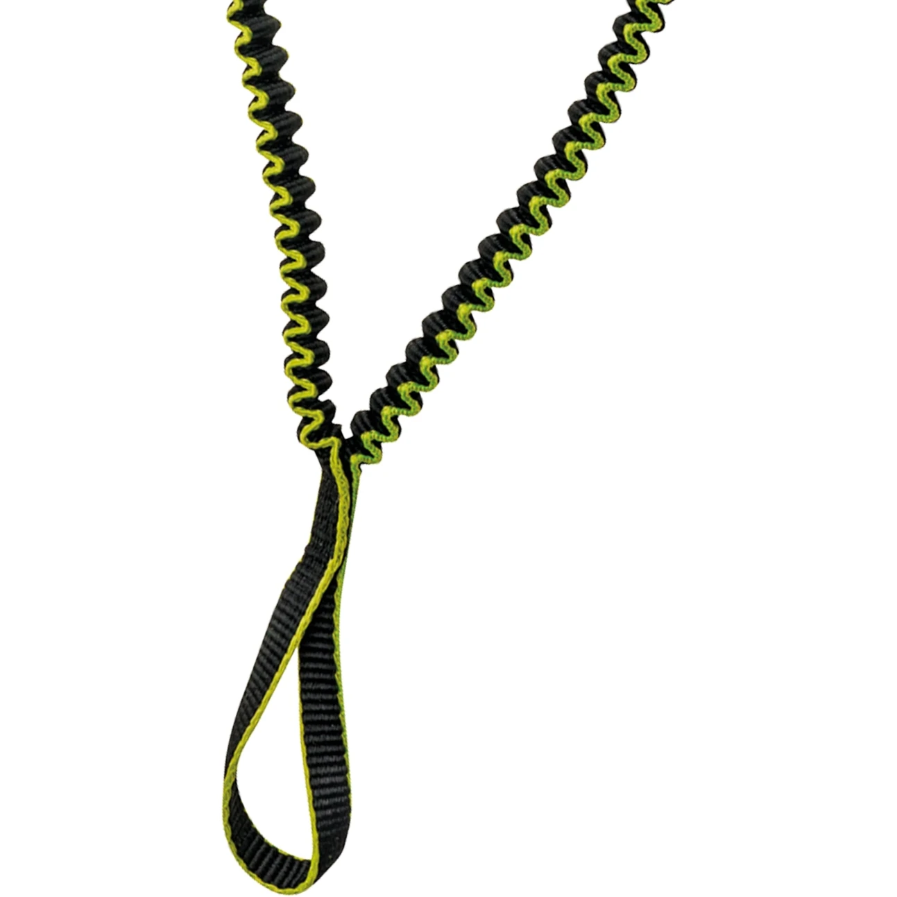 Elastische Y-slinger voor het vastzetten van ijsgereedschap bij het klimmen zonder handlussen.
