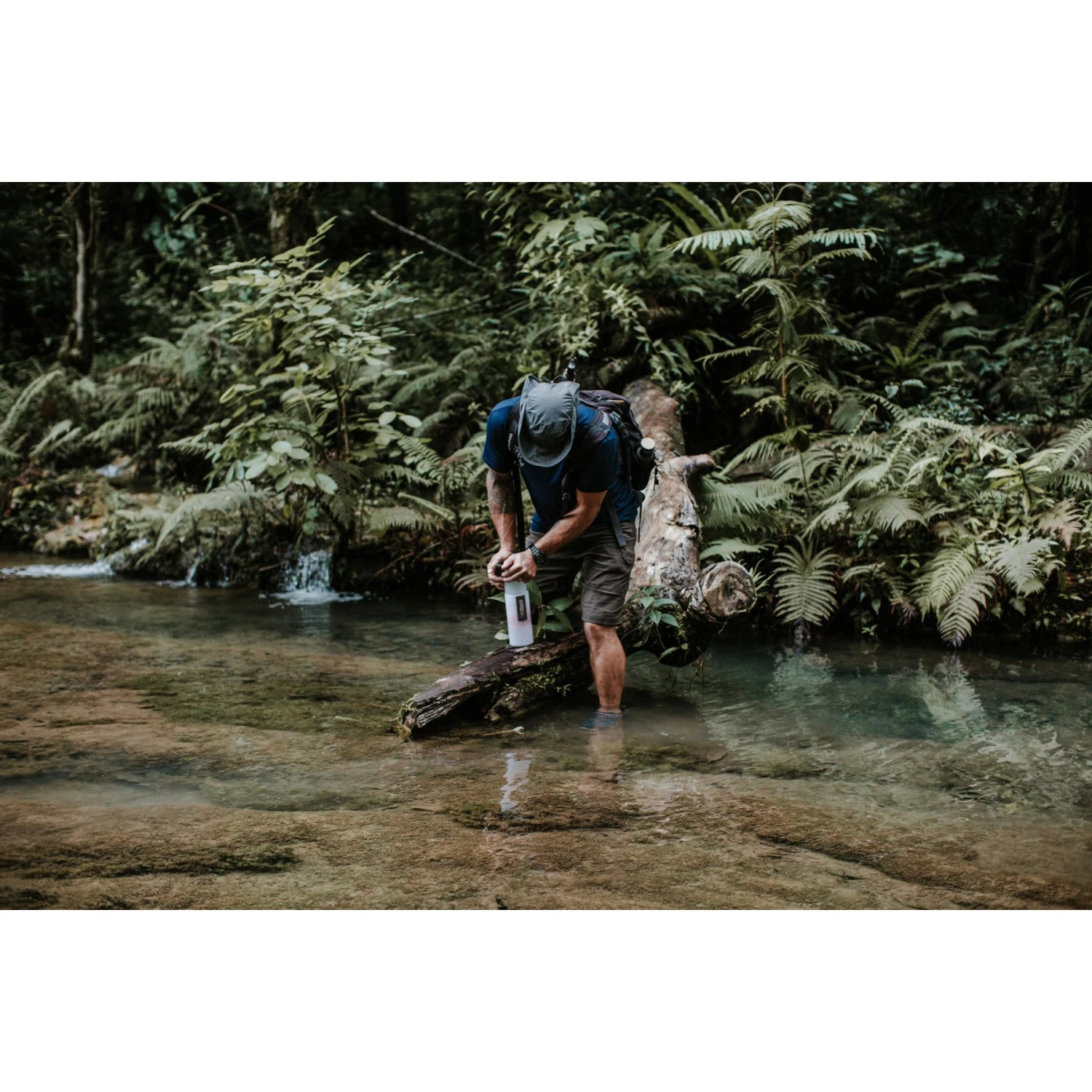 Het waterfilter past in elke rugzak of bekerhouder, hoeft niet te worden ingesteld en produceert 500 ml schoon water in slechts 10 seconden (3 L/min). Onopvallende filtratie en zuivering voor wandelaars, backpackers, jagers of avonturiers die discretie en snel stromend gezuiverd water zoeken om te drinken, watercontainers te vullen of te koken.