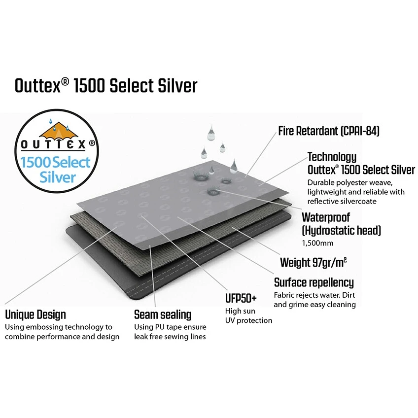Outtex® 1500 Select Silver is een slijtvast, duurzaam, vlamvertragend en met PU gecoat materiaal. Het is gemaakt van 100% polyester en is ontwikkeld met een perfecte gewicht/prestatieverhouding.
