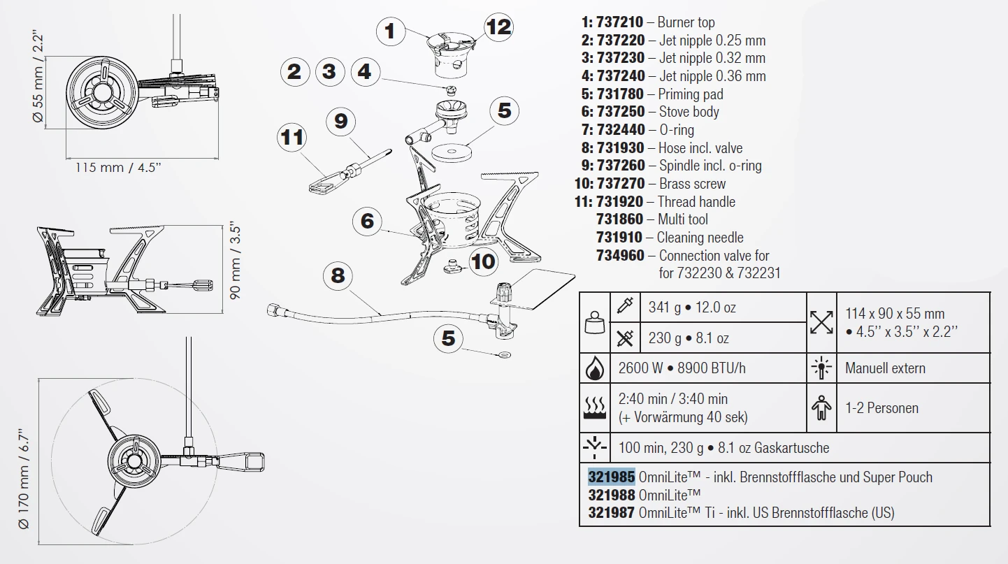 Kenmerken van het Primus OmniLite Ti multi-fuel fornuis