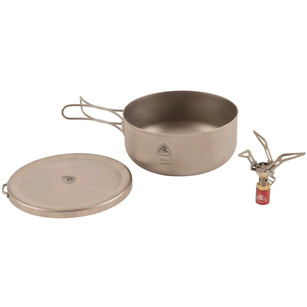 Lichte en compacte set van gasbrander en pan met deksel. Gemaakt van titanium voor optimale sterkte en corrosiebestendigheid.