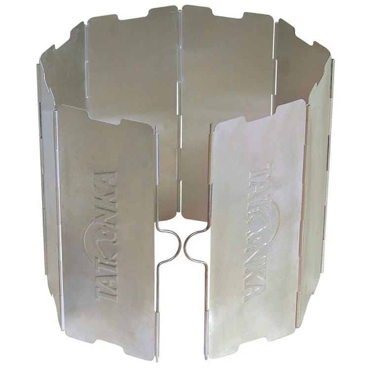 Aluminium windscherm voor de kookplaat. Vouw het zo nodig om het kooktoestel heen en veranker het in de grond met twee schuiven – klaar.