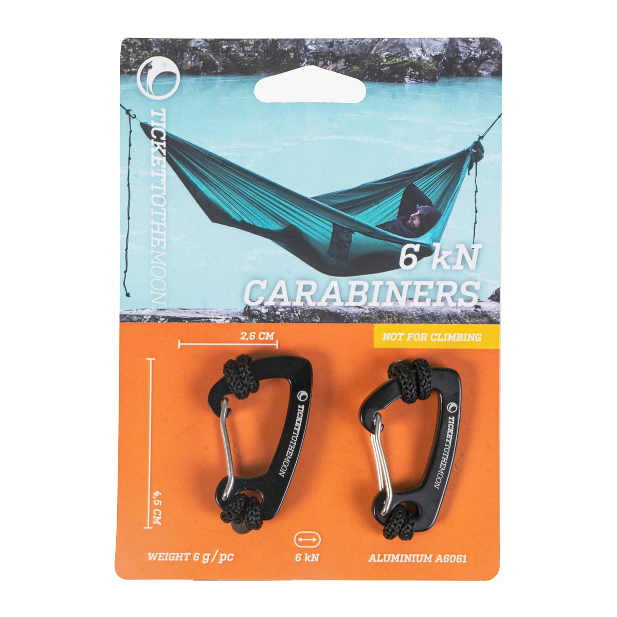 Ticket to the Moon heeft de Carabiner 06 ontworpen als een lichtgewicht optie. Sterk genoeg in elke situatie met een draagvermogen van 600 kg wanneer het oog gesloten is. De karabijnhaak is geschikt voor lichte hangmatten of ook als accessoire karabijnhaak.