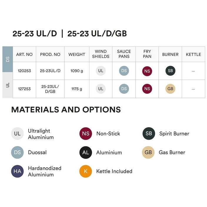 is Trangia’s unique super laminate. Duossal 2.0 is a perfect combination of two materials in one, pressed together under high pressure. Aluminium on the outside for good thermal conductivity, and stainless steel inside, which makes the pans scratch resistant and easy to clean. Duossal pans are durable and heat up quickly. The thickness of the material is a total of 0.8mm. Stainless steel 0.3 / Aluminium 0.5 mm.