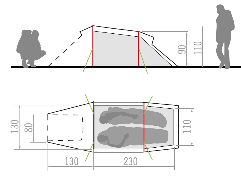 Your cozy home away from home: spacious 3 seasons tunnel tent for 2 people. The large interior offers plenty of sleeping space and generous stowage options for trekking gear and can also be pleasantly ventilated via the openings in the ridge. The Campo Arco 2P is set up quickly and does not take bad weather crooked. The ideal entry-level model for trekking tours in temperate climates.
